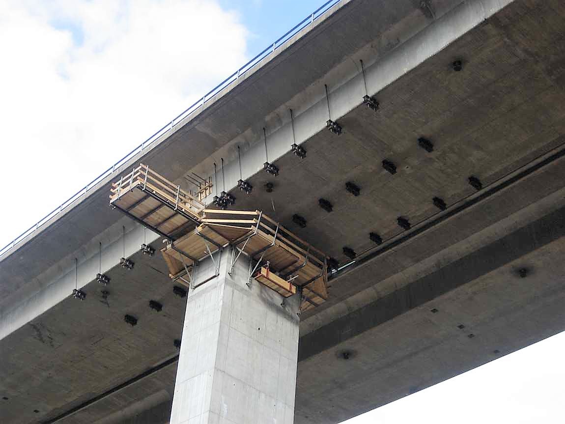 - Abtrennen der Kragarme auf ganzer Länge des quer vorgespannten Überbaus mit Kontrolle der Resttragwirksamkeit der Querspannglieder