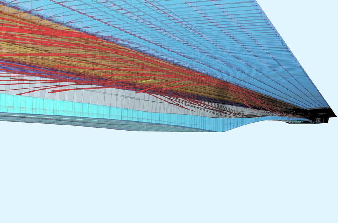 Anschließend wurden für die Bereiche mit festgestellten Defiziten Untersuchungen nach Stufe 4 der Nachrechnungsrichtlinie durchgeführt. Dazu wurden zum einen Festigkeitsuntersuchungen aus Bohrkernen, die aus den unteren Gurtplatten des Bauwerks gewonnen wurden, durchgeführt, um verbesserte Festigkeitswerte für die Nachberechnung zu erhalten. Zum anderen wurde eine nichtlineare Tragwerksberechnung an einem Faltwerkmodell unter Nutzung der nichtlinearen Tragfähigkeitsreserven durchgeführt (die Berechnungen in Stufe 1 und 2 erfolgten an einem Stabmodell mittels üblicher Rechen- und Bemessungsverfahren nach aktuellem Normenstand).