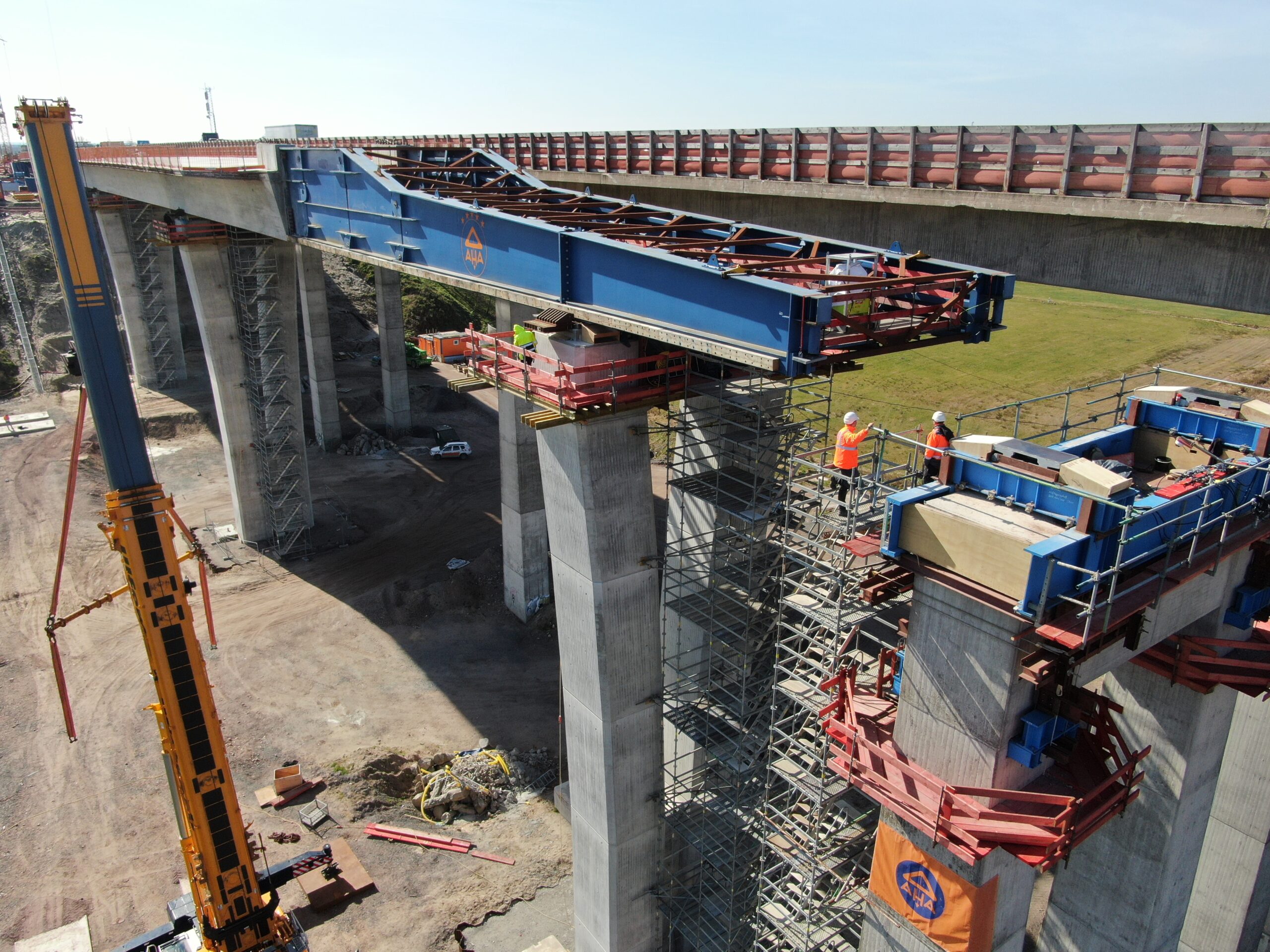 Für den Einschub über das im Endzustand eine Stützweite von 80,0 m aufweisende Huntefeld wurden die beiden flussnahen Bestandspfeiler als Hilfsstützen genutzt. Hierzu wurde diese pressengesteuert, um die Achslast auf maximal 10 MN zu begrenzen.